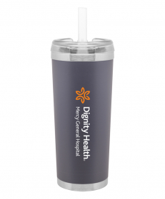 24 oz double wall 18/8 stainless steel thermal tumbler with copper vacuum insulation, stainless steel rim and base, threaded Eastman Tritan lid, snap closure, straw opening, and flexible wide silicone straw.