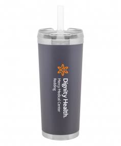 24 oz double wall 18/8 stainless steel thermal tumbler with copper vacuum insulation, stainless steel rim and base, threaded Eastman Tritan lid, snap closure, straw opening, and flexible wide silicone straw.