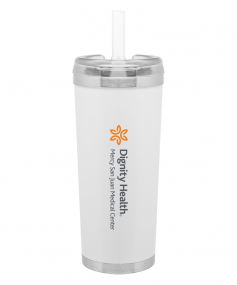 24 oz double wall 18/8 stainless steel thermal tumbler with copper vacuum insulation, stainless steel rim and base, threaded Eastman Tritan lid, snap closure, straw opening, and flexible wide silicone straw.