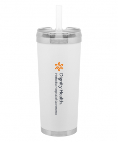 24 oz double wall 18/8 stainless steel thermal tumbler with copper vacuum insulation, stainless steel rim and base, threaded Eastman Tritan lid, snap closure, straw opening, and flexible wide silicone straw.