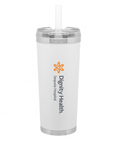 24 oz double wall 18/8 stainless steel thermal tumbler with copper vacuum insulation, stainless steel rim and base, threaded Eastman Tritan lid, snap closure, straw opening, and flexible wide silicone straw.