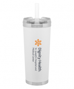 24 oz double wall 18/8 stainless steel thermal tumbler with copper vacuum insulation, stainless steel rim and base, threaded Eastman Tritan lid, snap closure, straw opening, and flexible wide silicone straw.
