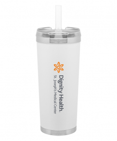 24 oz double wall 18/8 stainless steel thermal tumbler with copper vacuum insulation, stainless steel rim and base, threaded Eastman Tritan lid, snap closure, straw opening, and flexible wide silicone straw.