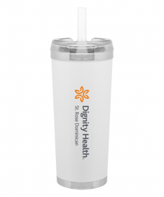 24 oz double wall 18/8 stainless steel thermal tumbler with copper vacuum insulation, stainless steel rim and base, threaded Eastman Tritan lid, snap closure, straw opening, and flexible wide silicone straw.
