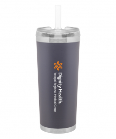 24 oz double wall 18/8 stainless steel thermal tumbler with copper vacuum insulation, stainless steel rim and base, threaded Eastman Tritan lid, snap closure, straw opening, and flexible wide silicone straw.