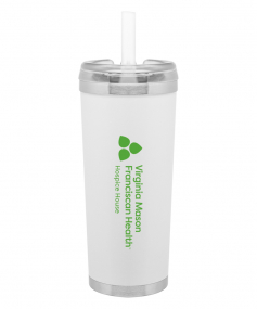 24 oz double wall 18/8 stainless steel thermal tumbler with copper vacuum insulation, stainless steel rim and base, threaded Eastman Tritan lid, snap closure, straw opening, and flexible wide silicone straw.