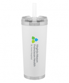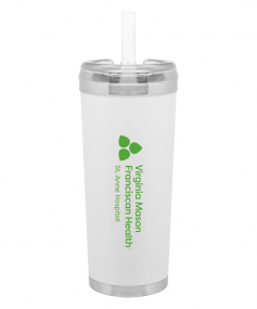 24 oz double wall 18/8 stainless steel thermal tumbler with copper vacuum insulation, stainless steel rim and base, threaded Eastman Tritan lid, snap closure, straw opening, and flexible wide silicone straw.