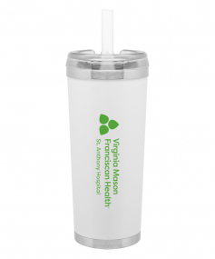 24 oz double wall 18/8 stainless steel thermal tumbler with copper vacuum insulation, stainless steel rim and base, threaded Eastman Tritan lid, snap closure, straw opening, and flexible wide silicone straw.