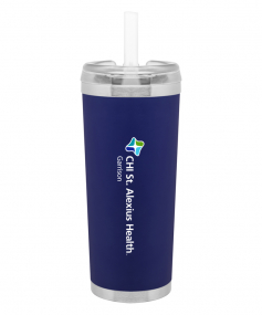 24 oz double wall 18/8 stainless steel thermal tumbler with copper vacuum insulation, stainless steel rim and base, threaded Eastman Tritan lid, snap closure, straw opening, and flexible wide silicone straw.
