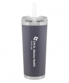 24 oz double wall 18/8 stainless steel thermal tumbler with copper vacuum insulation, stainless steel rim and base, threaded Eastman Tritan lid, snap closure, straw opening, and flexible wide silicone straw.