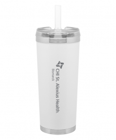 24 oz double wall 18/8 stainless steel thermal tumbler with copper vacuum insulation, stainless steel rim and base, threaded Eastman Tritan lid, snap closure, straw opening, and flexible wide silicone straw.