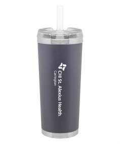 24 oz double wall 18/8 stainless steel thermal tumbler with copper vacuum insulation, stainless steel rim and base, threaded Eastman Tritan lid, snap closure, straw opening, and flexible wide silicone straw.
