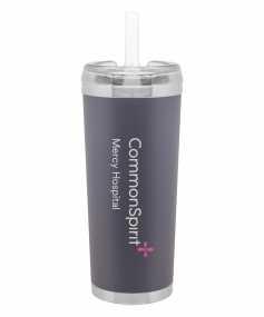 24 oz double wall 18/8 stainless steel thermal tumbler with copper vacuum insulation, stainless steel rim and base, threaded Eastman Tritan lid, snap closure, straw opening, and flexible wide silicone straw.