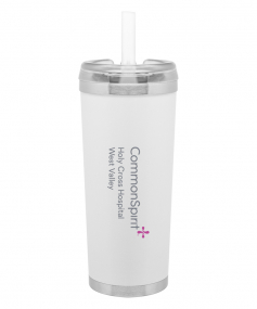 24 oz double wall 18/8 stainless steel thermal tumbler with copper vacuum insulation, stainless steel rim and base, threaded Eastman Tritan lid, snap closure, straw opening, and flexible wide silicone straw.