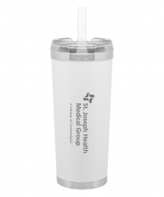 24 oz double wall 18/8 stainless steel thermal tumbler with copper vacuum insulation, stainless steel rim and base, threaded Eastman Tritan lid, snap closure, straw opening, and flexible wide silicone straw.