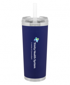 24 oz double wall 18/8 stainless steel thermal tumbler with copper vacuum insulation, stainless steel rim and base, threaded Eastman Tritan lid, snap closure, straw opening, and flexible wide silicone straw.