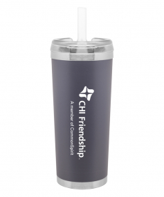 24 oz double wall 18/8 stainless steel thermal tumbler with copper vacuum insulation, stainless steel rim and base, threaded Eastman Tritan lid, snap closure, straw opening, and flexible wide silicone straw.