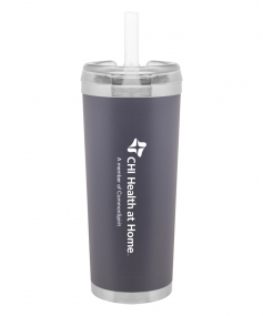 24 oz double wall 18/8 stainless steel thermal tumbler with copper vacuum insulation, stainless steel rim and base, threaded Eastman Tritan lid, snap closure, straw opening, and flexible wide silicone straw.