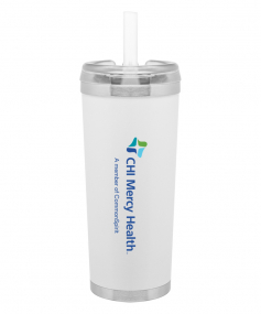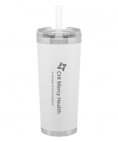 24 oz double wall 18/8 stainless steel thermal tumbler with copper vacuum insulation, stainless steel rim and base, threaded Eastman Tritan lid, snap closure, straw opening, and flexible wide silicone straw.