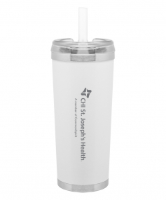 24 oz double wall 18/8 stainless steel thermal tumbler with copper vacuum insulation, stainless steel rim and base, threaded Eastman Tritan lid, snap closure, straw opening, and flexible wide silicone straw.