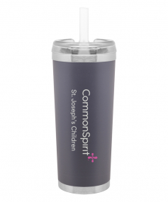 24 oz double wall 18/8 stainless steel thermal tumbler with copper vacuum insulation, stainless steel rim and base, threaded Eastman Tritan lid, snap closure, straw opening, and flexible wide silicone straw.
