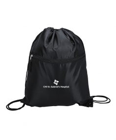 Sport bag with a contrast color front-zippered pocket, reinforced corners and a drawstring closure. Drawstrings double as backpack straps. 12 1/2" W x 15 1/2" H x 3/16" D.