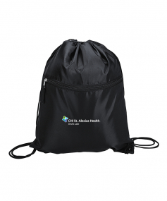 Sport bag with a contrast color front-zippered pocket, reinforced corners and a drawstring closure. Drawstrings double as backpack straps. 12 1/2" W x 15 1/2" H x 3/16" D.