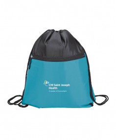 Sport bag with a contrast color front-zippered pocket, reinforced corners and a drawstring closure. Drawstrings double as backpack straps. 12 1/2" W x 15 1/2" H x 3/16" D.