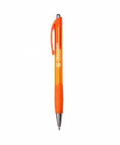 Click style transparent pen with matching rubber grip. Black medium point.