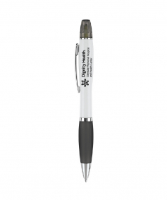 Twist-action ballpoint pen. Curvaceous glossy white barrel with translucent color rubber grip and matching highlighter cap. Shiny silver accents. Black pen comes with yellow highlighter ink. 5 11/16" L x 17/32" Diameter