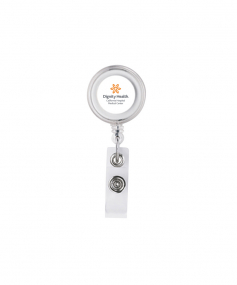 The Delfino round badge holder has a 36" retractable cable and crocodile clip on the back side. Complies with Prop 65. 1 1/4" W x 3 3/8" H x 3/4" D