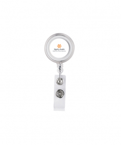 The Delfino round badge holder has a 36" retractable cable and crocodile clip on the back side. Complies with Prop 65. 1 1/4" W x 3 3/8" H x 3/4" D