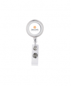 The Delfino round badge holder has a 36" retractable cable and crocodile clip on the back side. Complies with Prop 65. 1 1/4" W x 3 3/8" H x 3/4" D