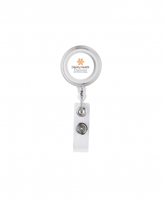 The Delfino round badge holder has a 36" retractable cable and crocodile clip on the back side. Complies with Prop 65. 1 1/4" W x 3 3/8" H x 3/4" D