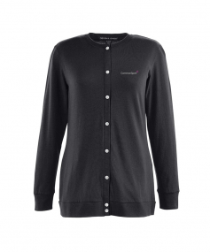 5 oz., 58% cotton, 39% modal, 3% spandex jersey; Soft modal blend drapes without clinging; Dyed-to-match grosgrain ribbon accents placket; Dura-Pearl buttons ideally spaced to avoid unflattering gaps; Banded rib knit cuffs and bottom hem; Longer 27" length (size medium) is ideal for wearing open or closed