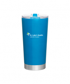 20 oz double wall 18/8 stainless steel thermal tumbler with vacuum insulation, and clear acrylic push-on swivel lid. Hand wash recommended. Do not microwave. Complies with FDA, Prop 65. 7.125" H x 3.75" W