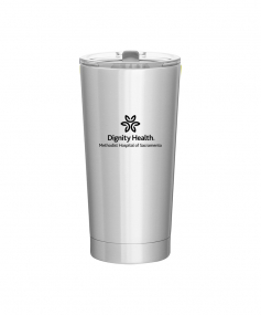 20 oz double wall 18/8 stainless steel thermal tumbler with vacuum insulation, and clear acrylic push-on swivel lid. Hand wash recommended. Do not microwave. Complies with FDA, Prop 65. 7.125" H x 3.75" W