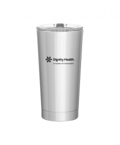 20 oz double wall 18/8 stainless steel thermal tumbler with vacuum insulation, and clear acrylic push-on swivel lid. Hand wash recommended. Do not microwave. Complies with FDA, Prop 65. 7.125" H x 3.75" W