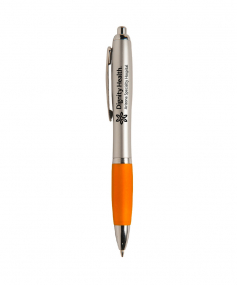 Classic retractable ballpoint pen with a soft rubber grip with a silver barrel, chrome plunger clip, and ring. Black medium point.