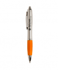 Classic retractable ballpoint pen with a soft rubber grip with a silver barrel, chrome plunger clip, and ring. Black medium point.