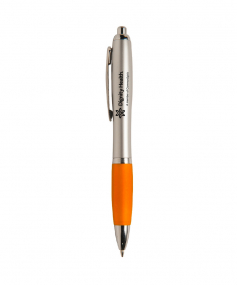 Classic retractable ballpoint pen with a soft rubber grip with a silver barrel, chrome plunger clip, and ring. Black medium point.