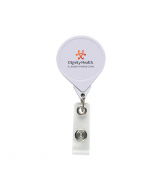 Jumbo round retractable badge reel with sonic welded plastic body, polished stainless steel internal spring, cord length 40", and durable vinyl strap. Features chrome finished Zinc Alloy, belt clip back, and anti-twist feature. Tested to 150,000 retractions. Made of recycled material. 1.5" W x 3.5" H x 0.38" D.