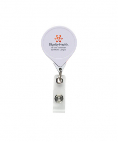 Jumbo round retractable badge reel with sonic welded plastic body, polished stainless steel internal spring, cord length 40", and durable vinyl strap. Features chrome finished Zinc Alloy, belt clip back, and anti-twist feature. Tested to 150,000 retractions. Made of recycled material. 1.5" W x 3.5" H x 0.38" D.