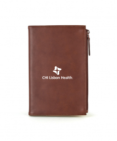 Stylish executive notebook with PU/split leather outer and suede inner cover. Features large zipper pocket (fits up to iPhone 7S Plus). Includes 80-sheet replaceable notebook. 5 3/4" H x 8 1/2" H