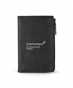 Stylish executive notebook with PU/split leather outer and suede inner cover. Features large zipper pocket (fits up to iPhone 7S Plus). Includes 80-sheet replaceable notebook. 5 3/4" H x 8 1/2" H