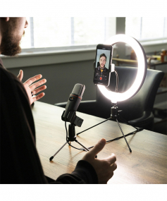 The McStreamy is a beautifully packaged kit including a light ring, phone holder, and a studio-quality microphone. The combination greatly enhances the visual and audio quality of any livestream or virtual meeting. The 10" light ring has an integrated phone holder and adjustable arm. The studio-quality, mic is paired with an elegant, portable stand. Both the light and mic are full-color imprinted as standard.