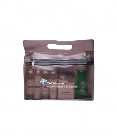 It's always the little things that are forgotten that are hard to find at your new place. We packed all the essentials into one handy tote. EST Shampoo, Conditioner, Body Wash, Lotion & Hand Soap, Old Spice and Dove Deodorants, Toothbrush, Colgate Toothpaste, Whispermint Mouthwash, Brush/Comb, Band Aids, Advil packet, Emergen-C Drink Packs, Alka Seltzer, Baby Wipes, Cotton Balls/Qtips, Tide Laundry Packet and Palmolive Dishwashing Soap. 9 1/2" W x 8" H x 2 3/4" D