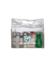 It's always the little things that are forgotten that are hard to find at your new place. We packed all the essentials into one handy tote. EST Shampoo, Conditioner, Body Wash, Lotion & Hand Soap, Old Spice and Dove Deodorants, Toothbrush, Colgate Toothpaste, Whispermint Mouthwash, Brush/Comb, Band Aids, Advil packet, Emergen-C Drink Packs, Alka Seltzer, Baby Wipes, Cotton Balls/Qtips, Tide Laundry Packet and Palmolive Dishwashing Soap. 9 1/2" W x 8" H x 2 3/4" D