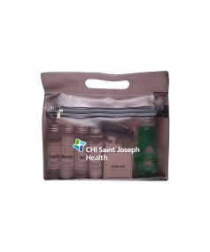 It's always the little things that are forgotten that are hard to find at your new place. We packed all the essentials into one handy tote. EST Shampoo, Conditioner, Body Wash, Lotion & Hand Soap, Old Spice and Dove Deodorants, Toothbrush, Colgate Toothpaste, Whispermint Mouthwash, Brush/Comb, Band Aids, Advil packet, Emergen-C Drink Packs, Alka Seltzer, Baby Wipes, Cotton Balls/Qtips, Tide Laundry Packet and Palmolive Dishwashing Soap. 9 1/2" W x 8" H x 2 3/4" D