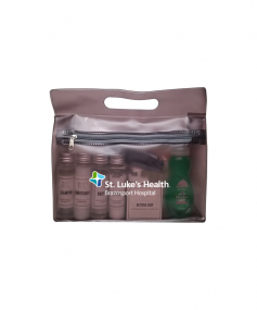 It's always the little things that are forgotten that are hard to find at your new place. We packed all the essentials into one handy tote. EST Shampoo, Conditioner, Body Wash, Lotion & Hand Soap, Old Spice and Dove Deodorants, Toothbrush, Colgate Toothpaste, Whispermint Mouthwash, Brush/Comb, Band Aids, Advil packet, Emergen-C Drink Packs, Alka Seltzer, Baby Wipes, Cotton Balls/Qtips, Tide Laundry Packet and Palmolive Dishwashing Soap. 9 1/2" W x 8" H x 2 3/4" D
